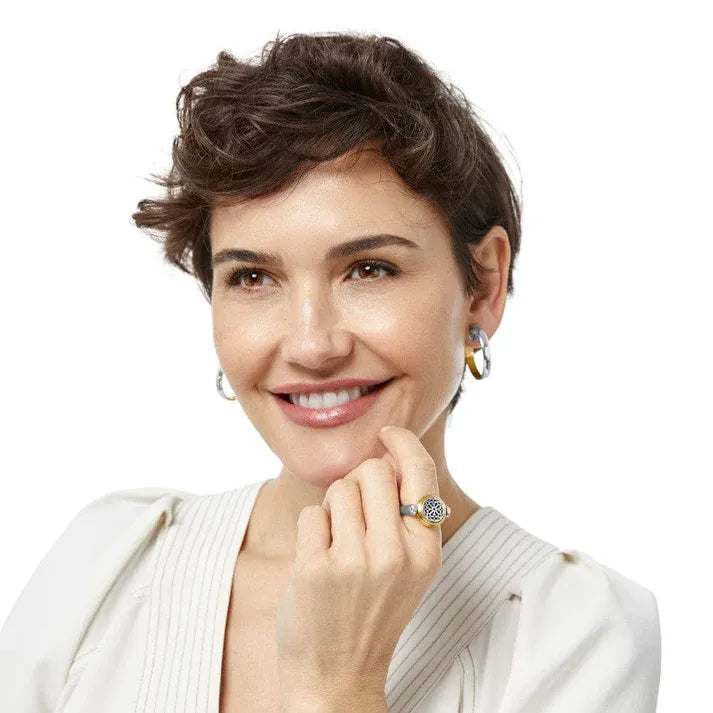 The Ferrara motif comes to life in three-dimensional mixed metals and filigree. Its center ornament reverses to a hammered silver texture, with gold on the perimeter.