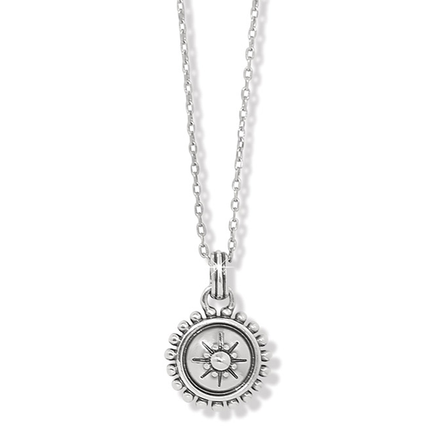This pendant features a brushed gold inlaid center, decorated with etched designs and a center crystal in silver shade color. It’s the perfect piece to wear when you are needing something o wear that’s a little on the delicate side.