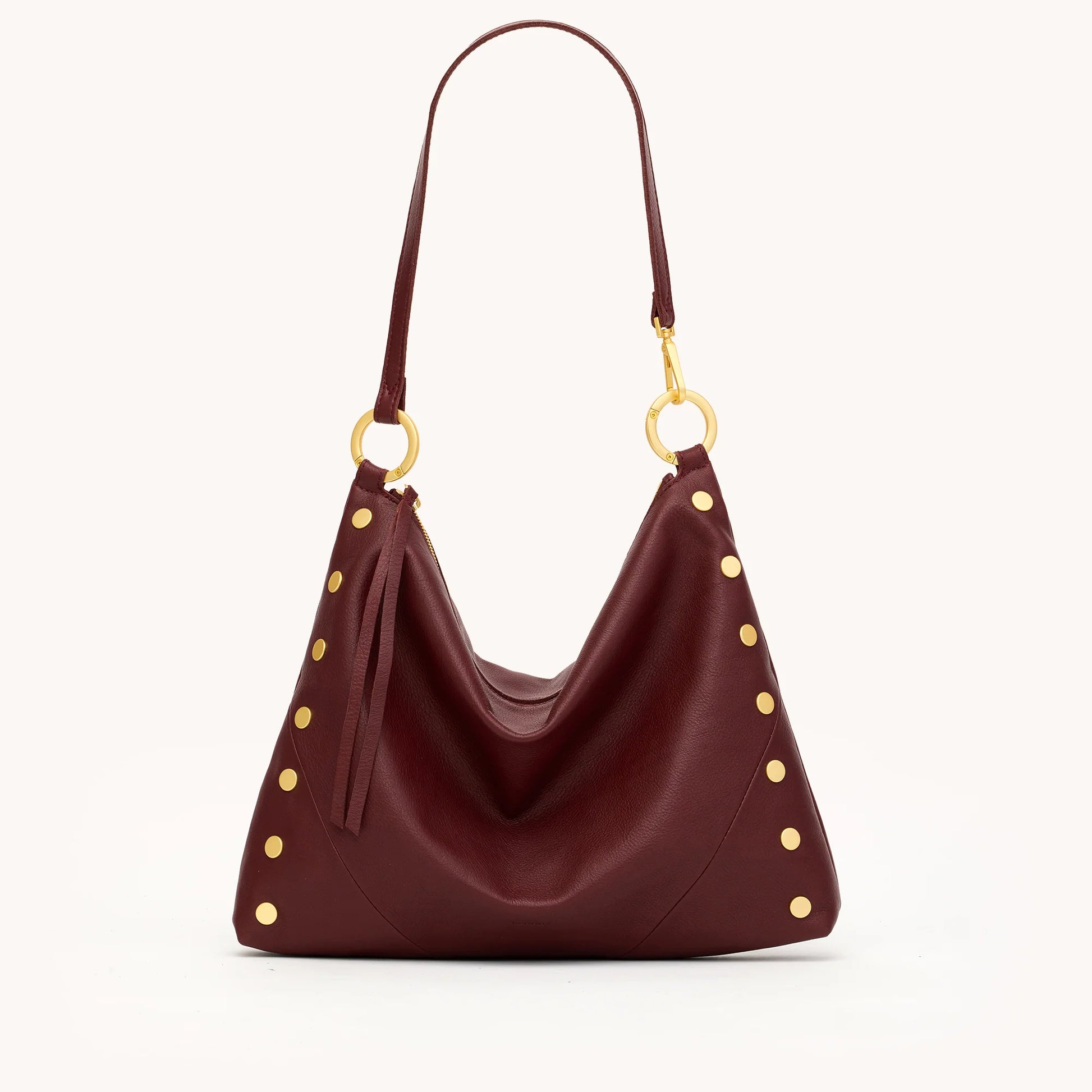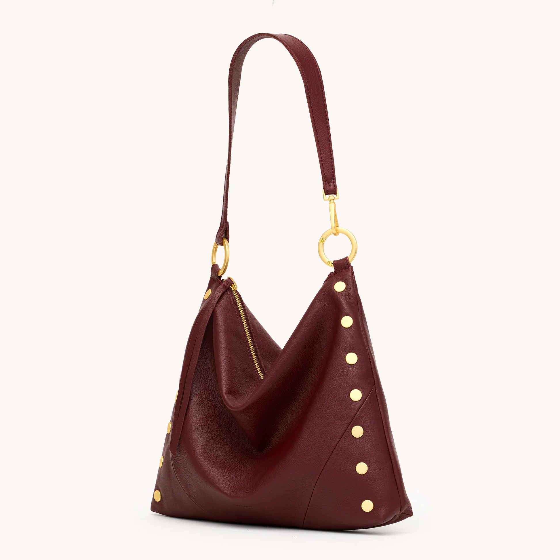 - Crafted with a deep oxblood red pebble leather with brown and red undertones