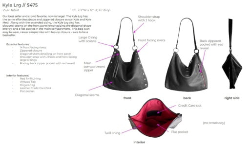 - Exterior: tassel zipper pull, o-rings for strap attachments, back zip cell pocket - vertical opening, zippered main compartment, diagonal seams