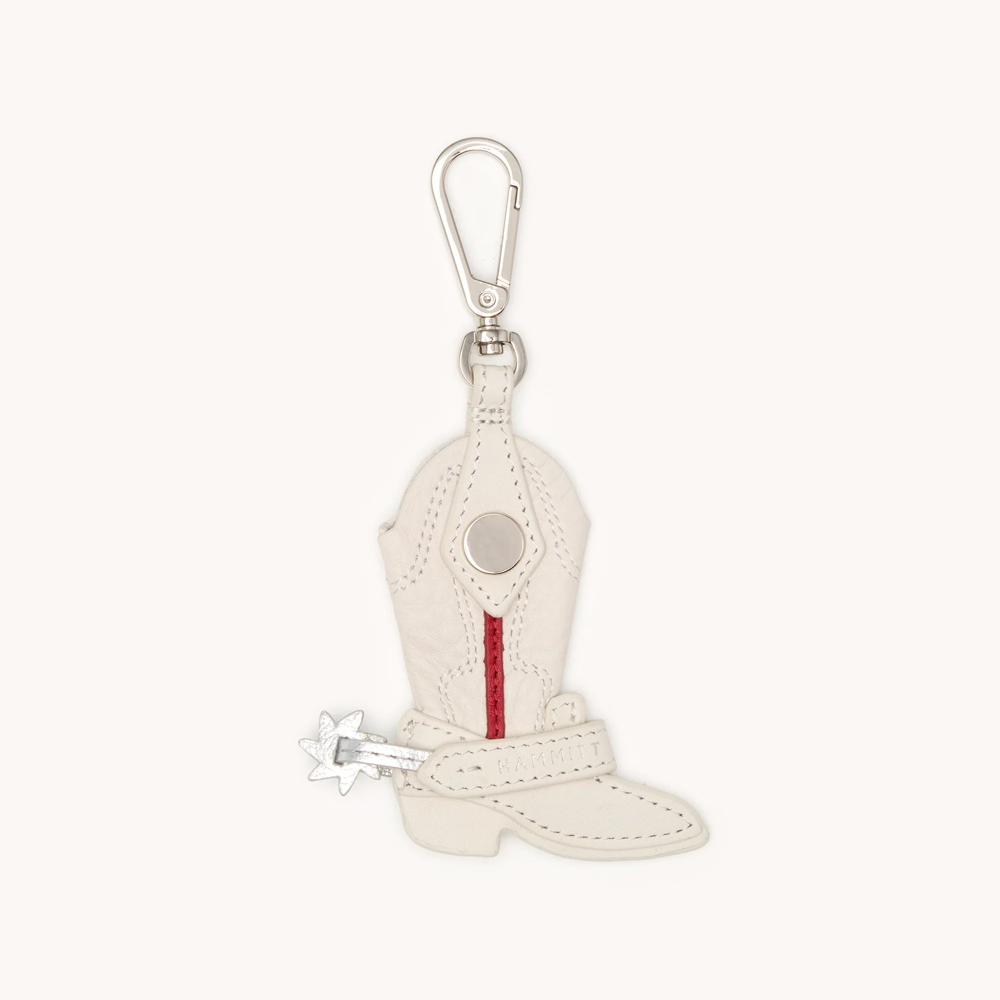 In your country era? Kick up your heels with a crisp white charm that will enhance any bag. This bright little boot features a foiled logo, shiny silver rivet, and metallic leather spur.