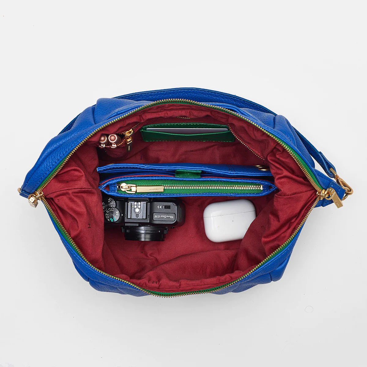 BRAND NEW WITH TAGS!! Gorgeous pebbled leather in a vibrant bright blue shade Brushed Gold Hardware Red fabric interior Green accent zipper and coordinating inside credit card slot. Back phone pocket with magnetic closure. Double zip closure on top. Zip pocket and ID slot inside. Care registration card. Handle strap and crossbody adjustable strap Hammitt Dustbag included