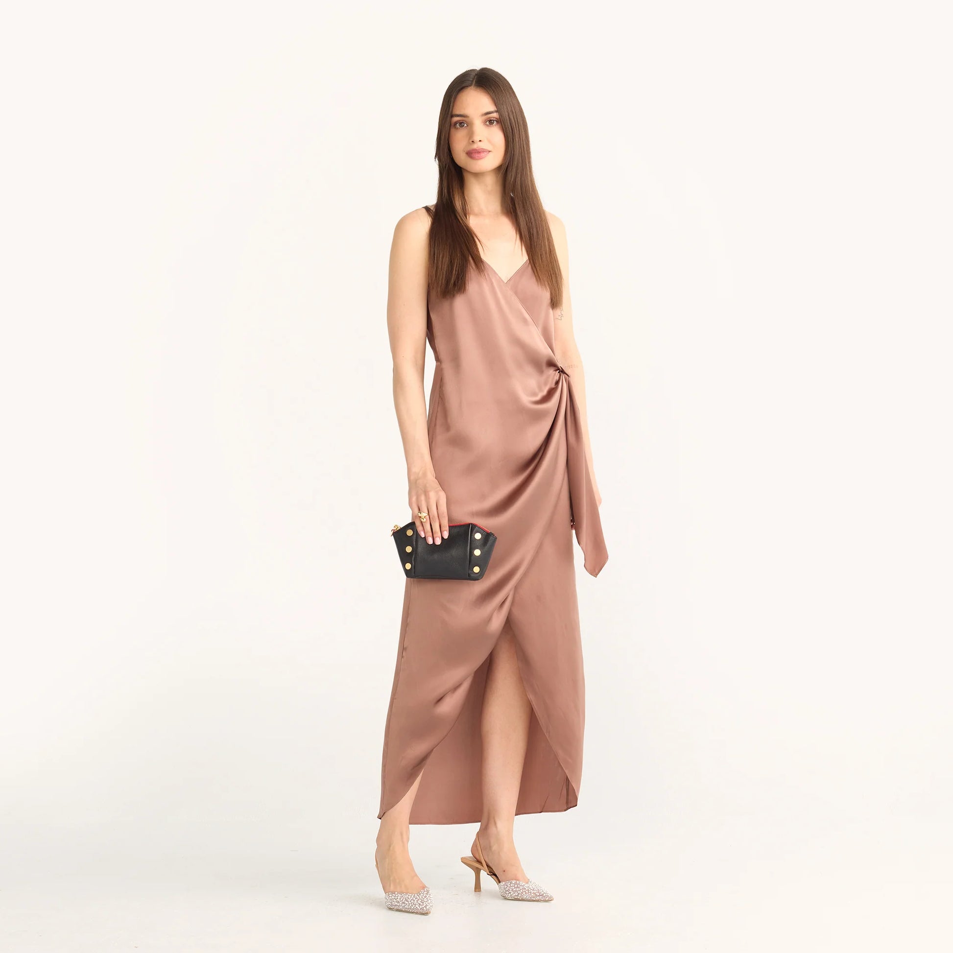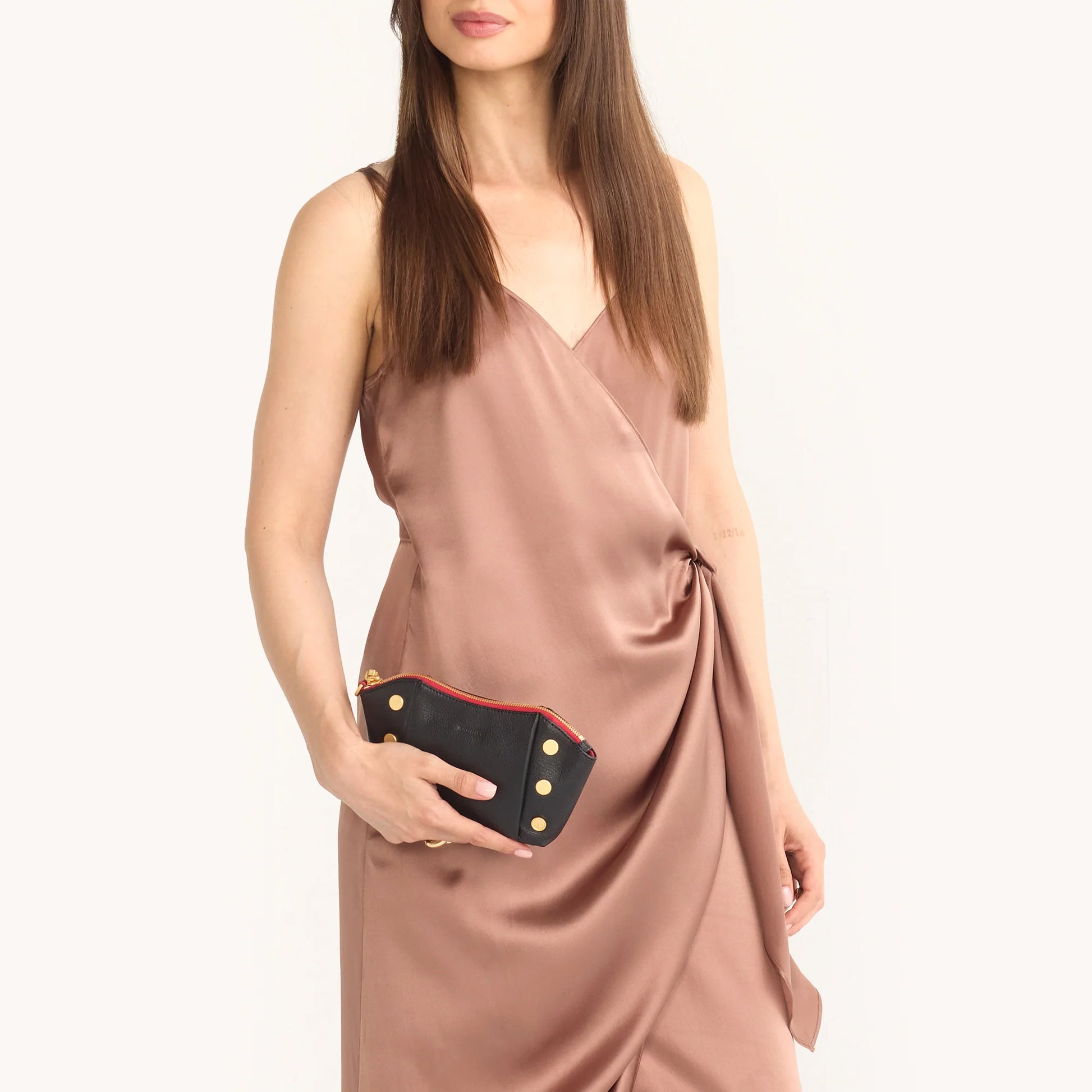Our Paul Pocket makes an elegant companion for the award-nominated Paul Lrg. With similar dramatic shaping and front-facing rivets, this zippered pouch follows all of the requirements from the Paul family, and has suede lining and wrapped folds for an added luxe touch.