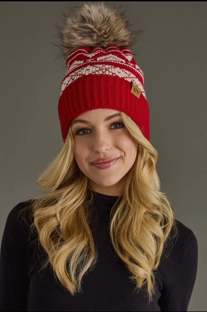 Red & Cream Patterned Pom Hat