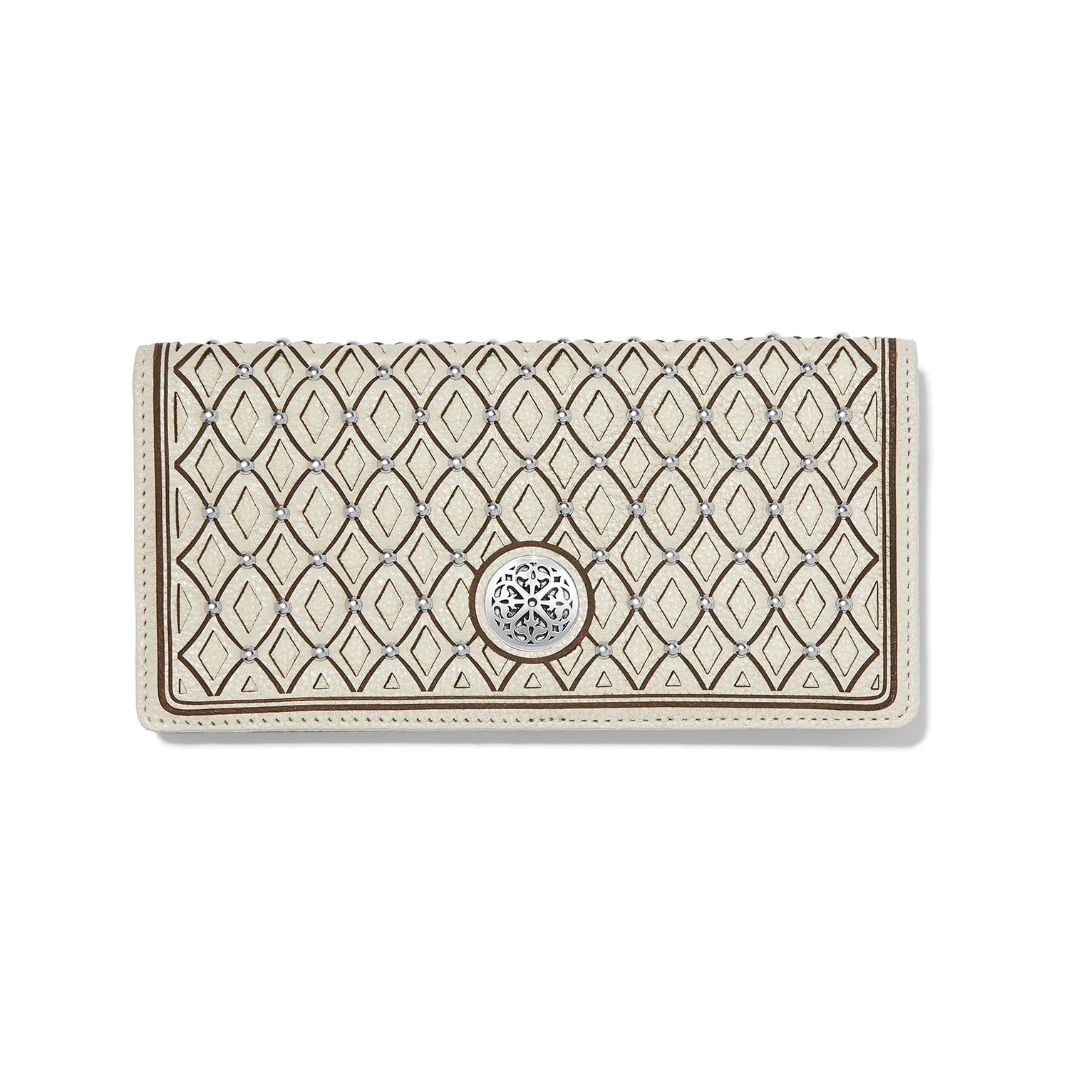 Lasered, die cut, laced and heavily stitched - this fine leather wallet is filled with crafted features while practical with enough room for all your essentials. Studded details accentuate each die-cut diamond. Casual yet strikingly worthy of conversation, it is inspired by the Venetian squares of Northern Italy.