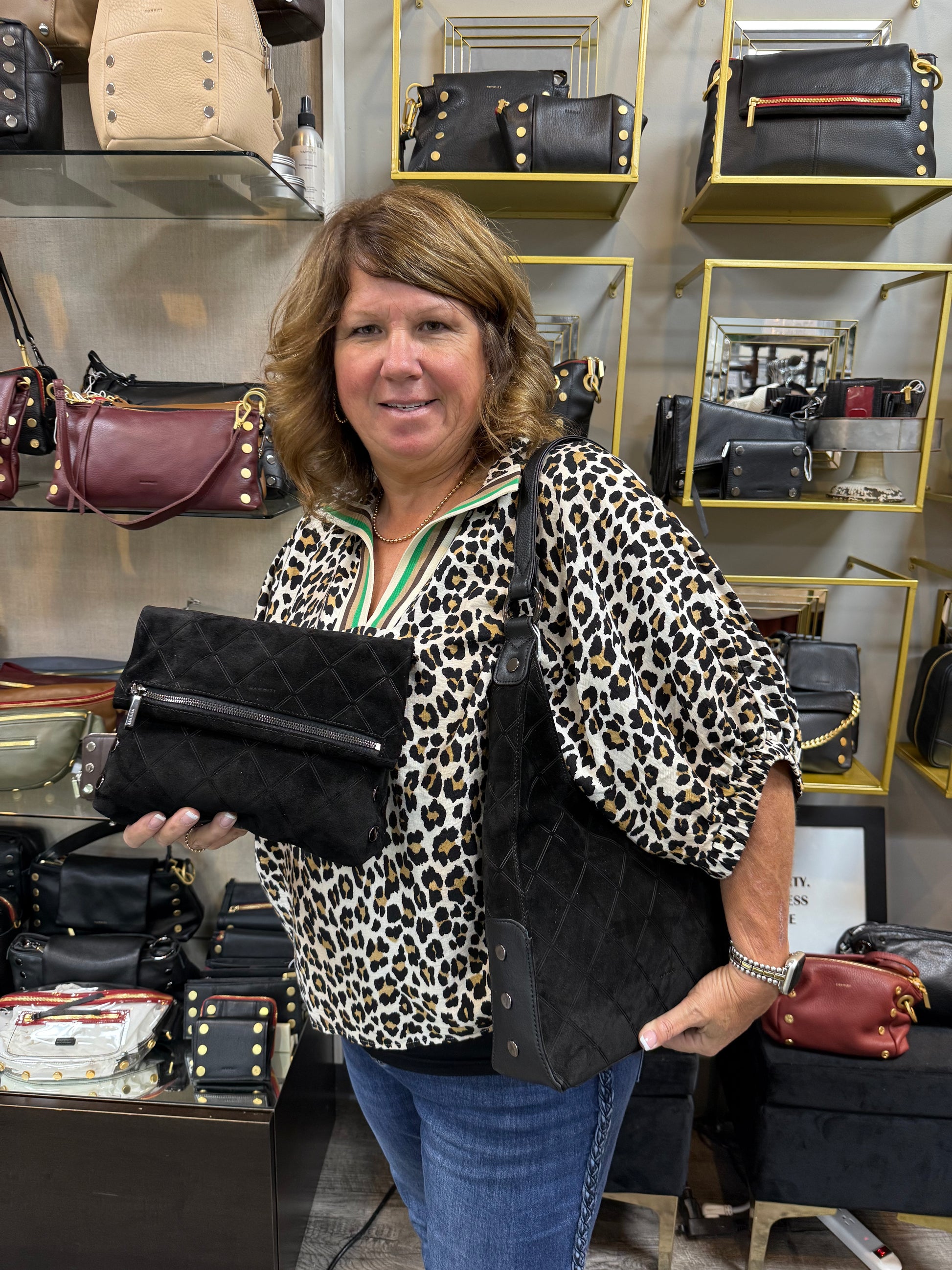 - Crafted with a deep black Italian suede with a unique doubled diamond embossing effect and black pebble leather accents